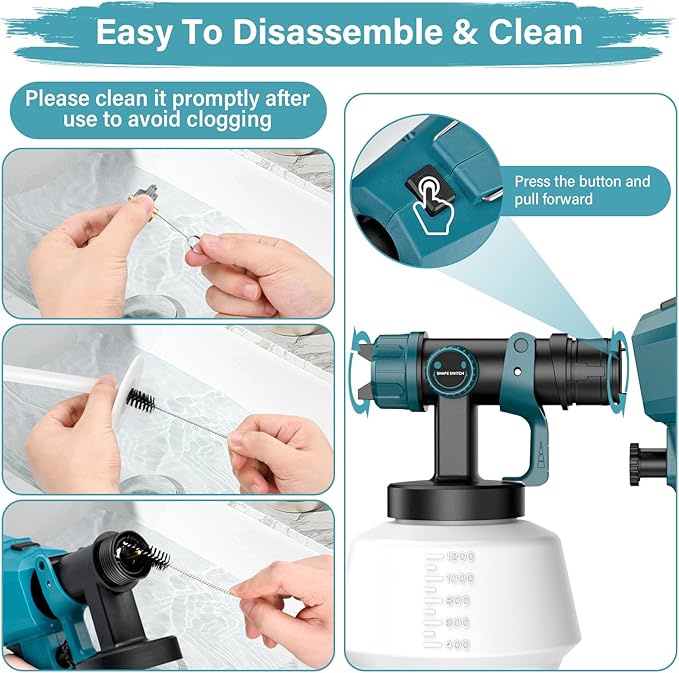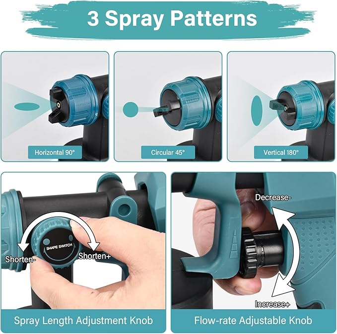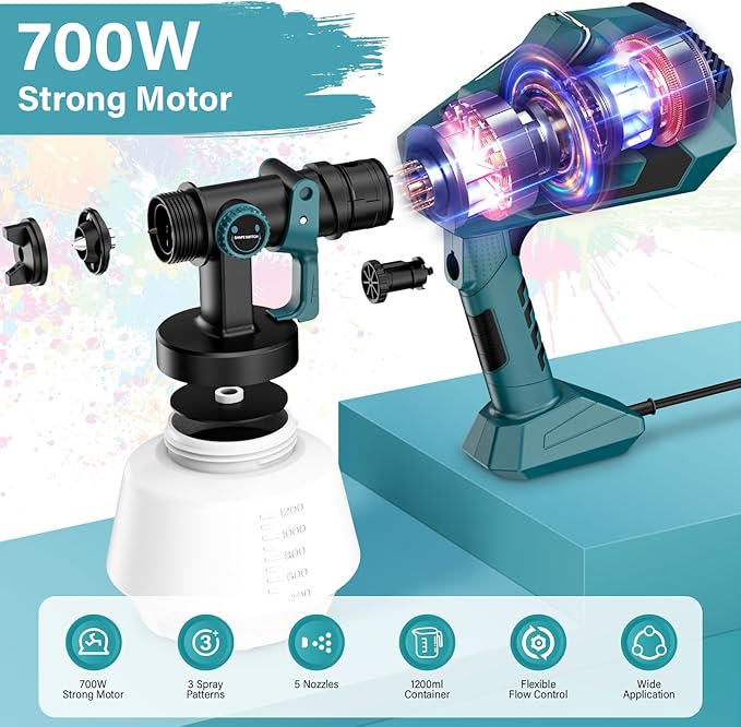 Akdomart AK-17 — elektryczny pistolet malarski HVLP 700 W z pojemnym zbiornikiem 1200 ml i pięcioma wymiennymi dyszami o średnicach od 1 mm do 3 mm, oferujący trzy tryby natrysku (poziomy, pionowy i okrężny) oraz regulację przepływu farby — idealny do malowania ogrodzeń, mebli, ścian i sufitów