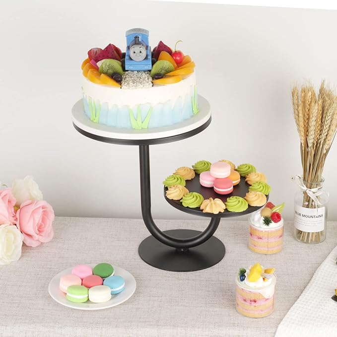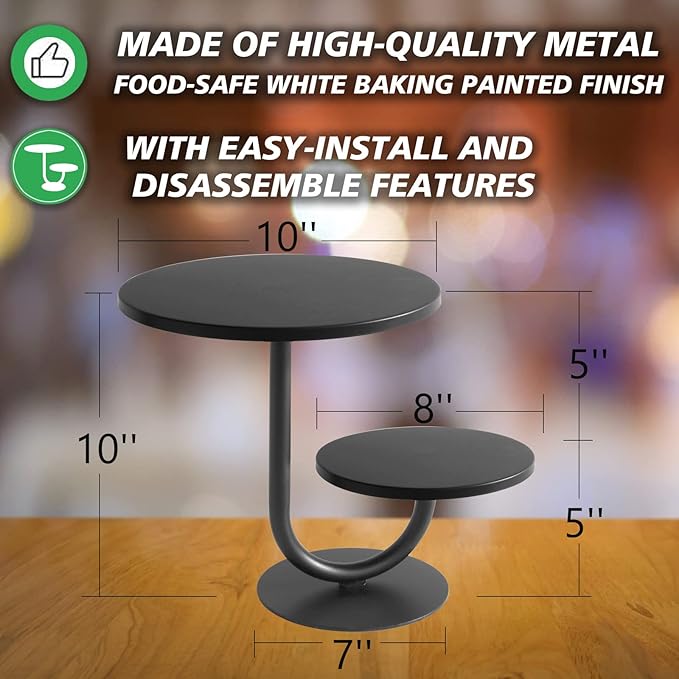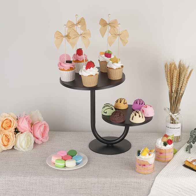 Dwupoziomowa patera na ciasto i babeczki – elegancka metalowa etażerka w kolorze matowej czerni, składająca się z dwóch tac o średnicy 25 cm (10 cali) i 20 cm (8 cali). Idealna do serwowania tortów, babeczek, ciasteczek, owoców i deserów. Stabilna konstrukcja sprawia, że doskonale sprawdzi się podczas wesel, przyjęć, baby shower, urodzin czy jako element dekoracyjny do domu.