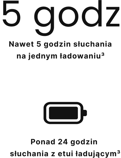 W tym modelu słuchawek bateria może wytrzymać nawet do 5-ciu godzin słuchania muzyki na jednym naładowaniu. Podładowując je od etui można słuchać muzyki nawet do 30 godzin.