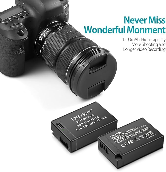 ENEGON bateria LP-E17 z portem ładowania Type-C (1500 mAh) to zamiennik do aparatów Canon (Rebel, EOS R/M). Pozwala na ładowanie bezpośrednio przez USB-C — z power banka, laptopa, ładowarki sieciowej — bez potrzeby stosowania osobnej ładowarki. Pojemność 1500 mAh zapewnia dłuższą pracę aparatu. Bateria posiada zabezpieczenia (przeciwprzepięciowe, termiczne, przeciwzwarciowe) i pasuje do wielu modeli Canon (SL2/SL3/T7i/T6i/M3/M6/200D/250D/750D/800D/RP i inne)