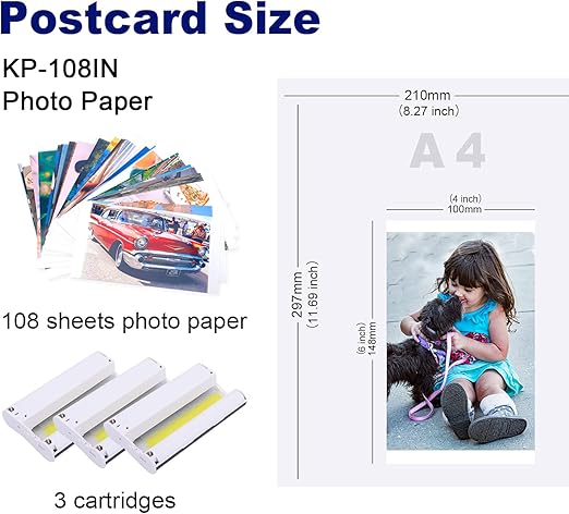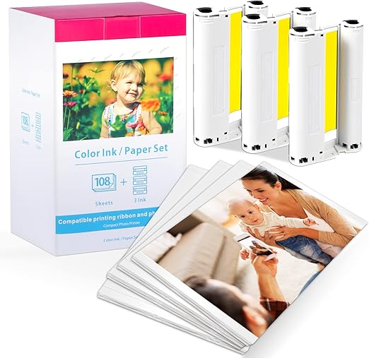 Oryginalny zestaw Canon KP-108IN / 3115B001 do drukarek Selphy CP-1300, CP-1200, CP-1000, CP-910, CP-740 zawiera 108 błyszczących arkuszy formatu 100 × 148 mm (4 × 6″) oraz trzy kasety z barwnymi atramentami — dzięki technologii sublimacji barwnikowej gwarantuje trwałe, wodoodporne i odporne na blaknięcie wydruki w jakości studia fotograficznego