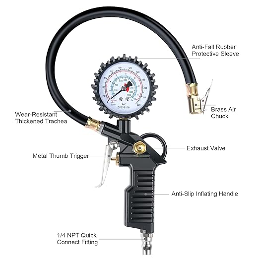 Profesjonalny miernik ciśnienia w oponach marki VSSHE wyposażony w pistolet do pompowania, elastyczny wąż oraz czytelny manometr z zakresem do 220 PSI (16 barów). Urządzenie umożliwia szybkie sprawdzenie oraz regulację ciśnienia w oponach samochodowych, motocyklowych i rowerowych. Solidna konstrukcja z metalowymi elementami oraz gumową osłoną chroniącą manometr zapewnia trwałość i bezpieczeństwo użytkowania.