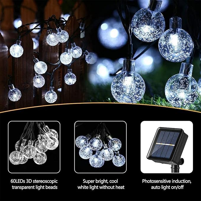 Solarne lampki ogrodowe 36 ft z 60 diodami LED w formie kryształowych kul, zasilane energią słoneczną, wodoodporne, idealne do dekoracji ogrodu, tarasu, podwórka oraz na imprezy i święta, klasa energetyczna A++
