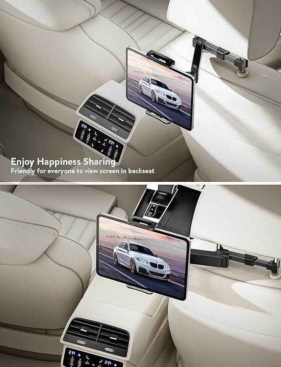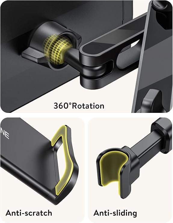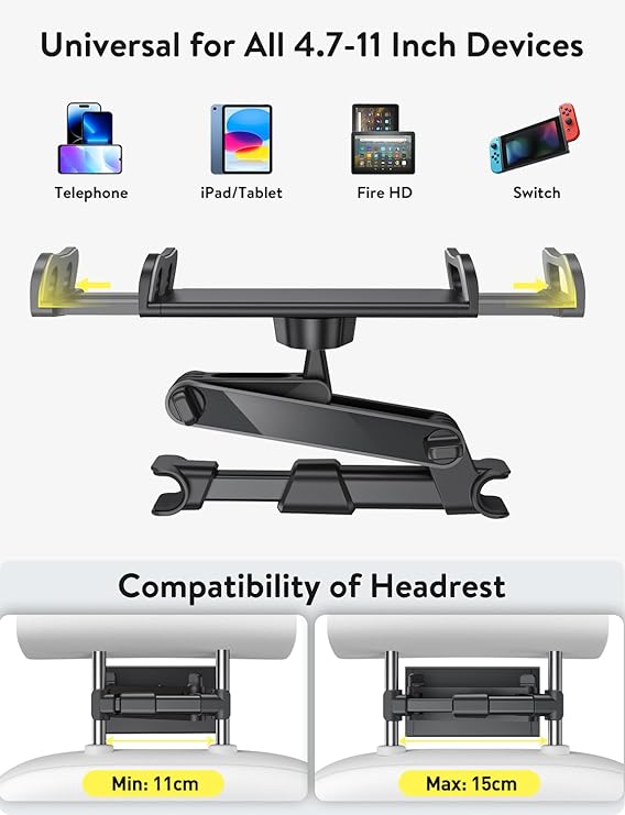 Tryone Uchwyt tablet na zagłówek samochodu – regulowany uchwyt, który montuje się na zagłówek fotela. Posiada teleskopowe ramię (do ok. 46 cm długości), które można złożyć, gdy nie jest używane. Oferuje 360° obrót, co pozwala na wygodne ustawienie kąta widzenia. Kompatybilny z urządzeniami o przekątnej od 4,7 do 12,9 cala (tablety, smartfony, Nintendo Switch). Miękkie, silikonowe zaciski chronią urządzenie przed zarysowaniem i stabilnie trzymają je podczas jazdy. Prostym montażem można obsłużyć jedną ręką — idealne rozwiązanie dla komfortu dzieci na tylnym siedzeniu.