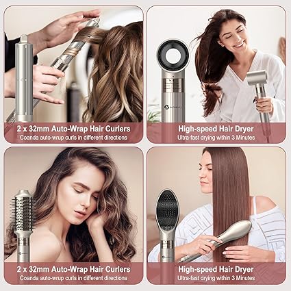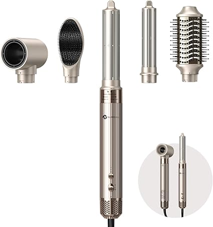 Wielofunkcyjna suszarka do włosów o mocy 110000 RPM z jonizacją, zapewniająca szybkie suszenie bez puszenia. Zestaw obejmuje 5 końcówek: automatyczną lokówkę, prostownicę, szczotkę do objętości oraz akcesoria do stylizacji, dzięki czemu można uzyskać różne fryzury w jednym urządzeniu. Elegancki design w kolorze złotym.