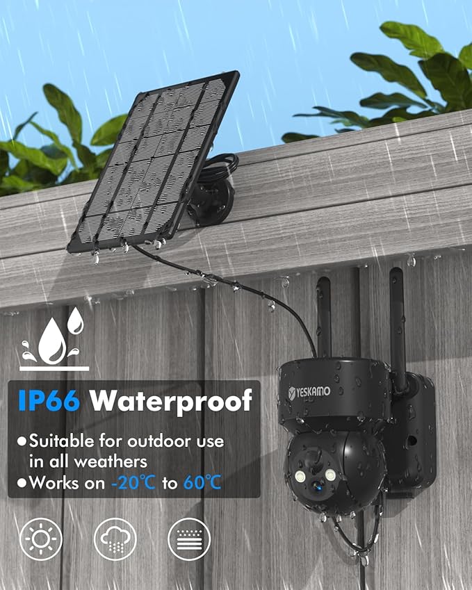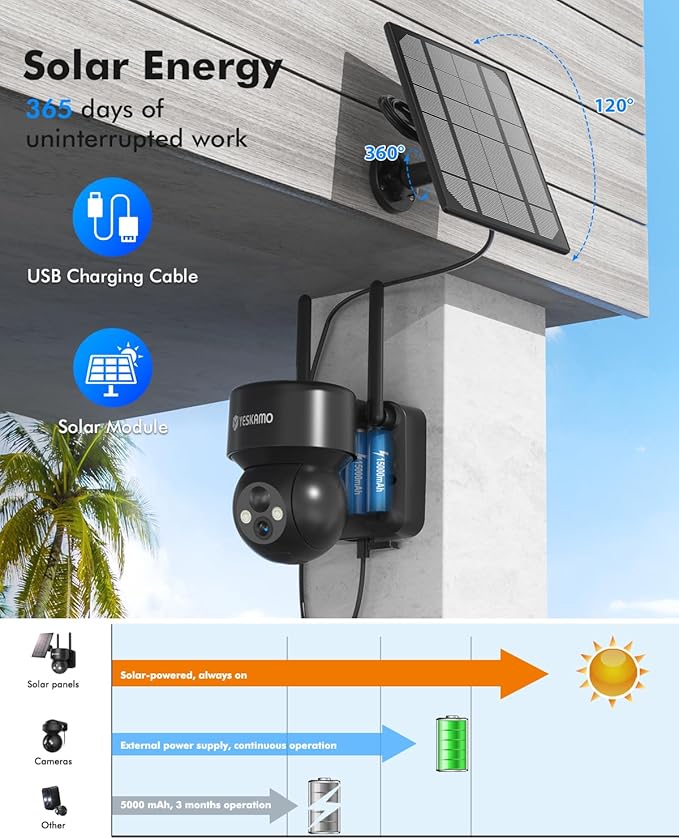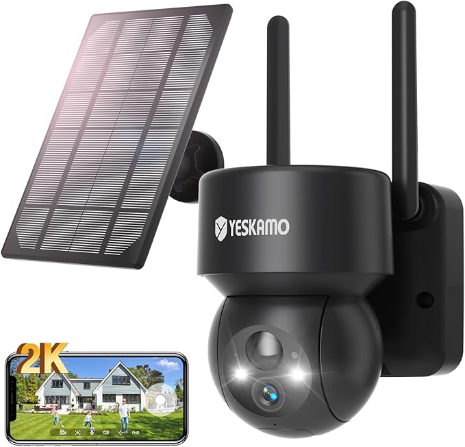 YESKAMO 2K bezprzewodowa kamera WiFi na zewnątrz z panelem słonecznym oferuje całkowicie bezprzewodową instalację dzięki ładowaniu energią słoneczną i pracy na akumulatorze przez 365 dni, 2.4 GHz WiFi, 130° obiektyw z obrotem 355° i pochylem 120°, odporność na warunki atmosferyczne IP66, kolorowe widzenie nocne 2K z detekcją ludzi PIR i syreną, dwukierunkowy dźwięk, zoom 5x oraz inteligentne rozróżnianie ludzi od zwierząt i pojazdów. Obsługuje lokalne przechowywanie MicroSD do 128GB, chmurę z szyfrowaniem danych i prostą instalację w dowolnym miejscu, zapewniając bezpieczny nadzór przez całą dobę.