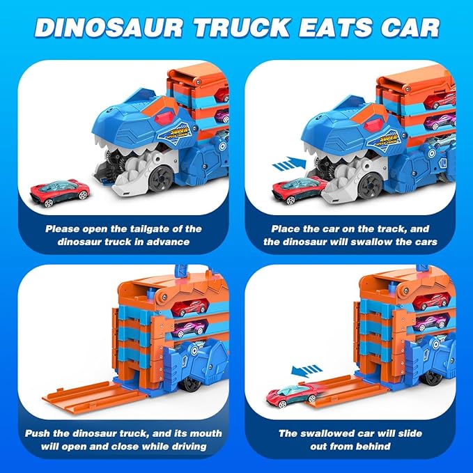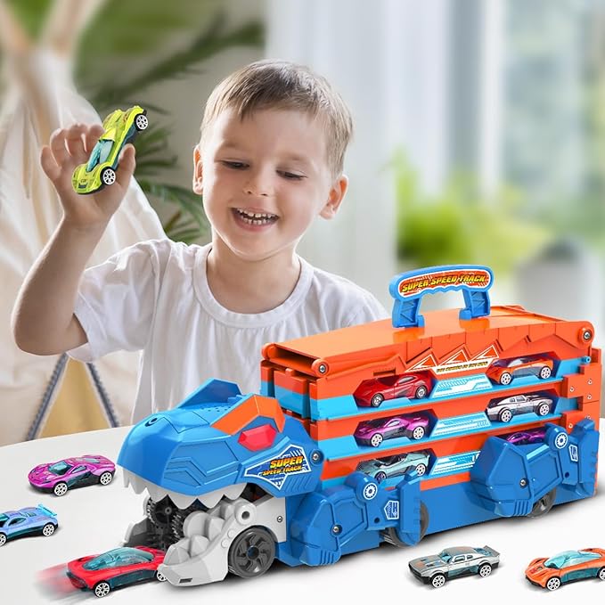 Edukacyjna zabawka dla dzieci w wieku 3–6 lat. Ciężarówka w kształcie dinozaura łączy funkcje transportu, toru wyścigowego i garażu. Wyposażona w efekty dźwiękowe i świetlne, może pomieścić do 18 mini samochodzików. W zestawie znajduje się 8 pojazdów wyścigowych. Zabawka rozwija wyobraźnię i zdolności manualne dziecka
