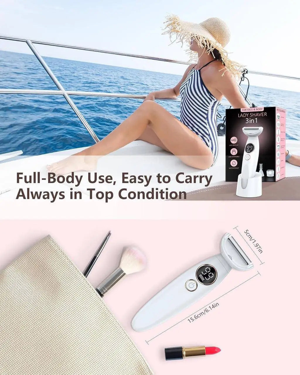 Żeński trymer 3-w-1 to uniwersalna elektryczna maszynka do usuwania owłosienia z twarzy, ciała i strefy bikini. Wyposażony w kilka nasadek, zapewnia wygodną i skuteczną depilację w domu oraz w podróży.