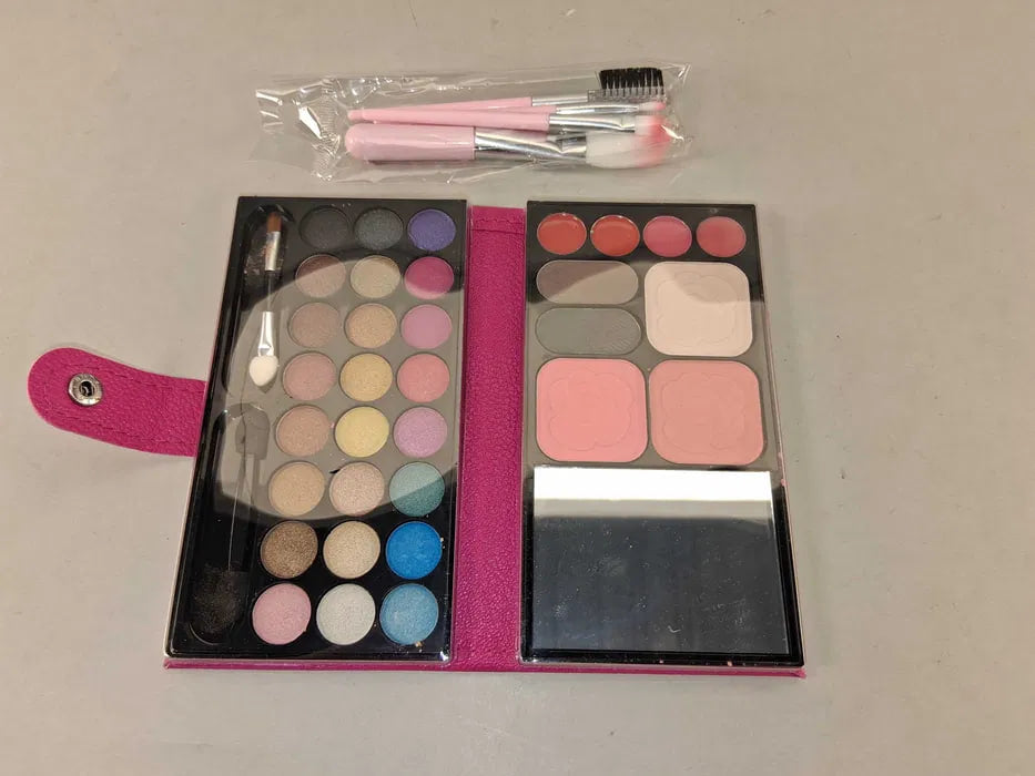 Zestaw do makijażu dla dzieci „O038” zawiera paletkę cieni do powiek w różnych odcieniach, róż do policzków oraz zestaw pędzelków ułatwiających aplikację. Wszystko mieści się w kompaktowym etui, które prawdopodobnie zamyka się na magnes, co czyni go łatwym do przechowywania i zabrania w podróż. Produkt jest przeznaczony do bezpiecznej zabawy i codziennego użytku przez dzieci.