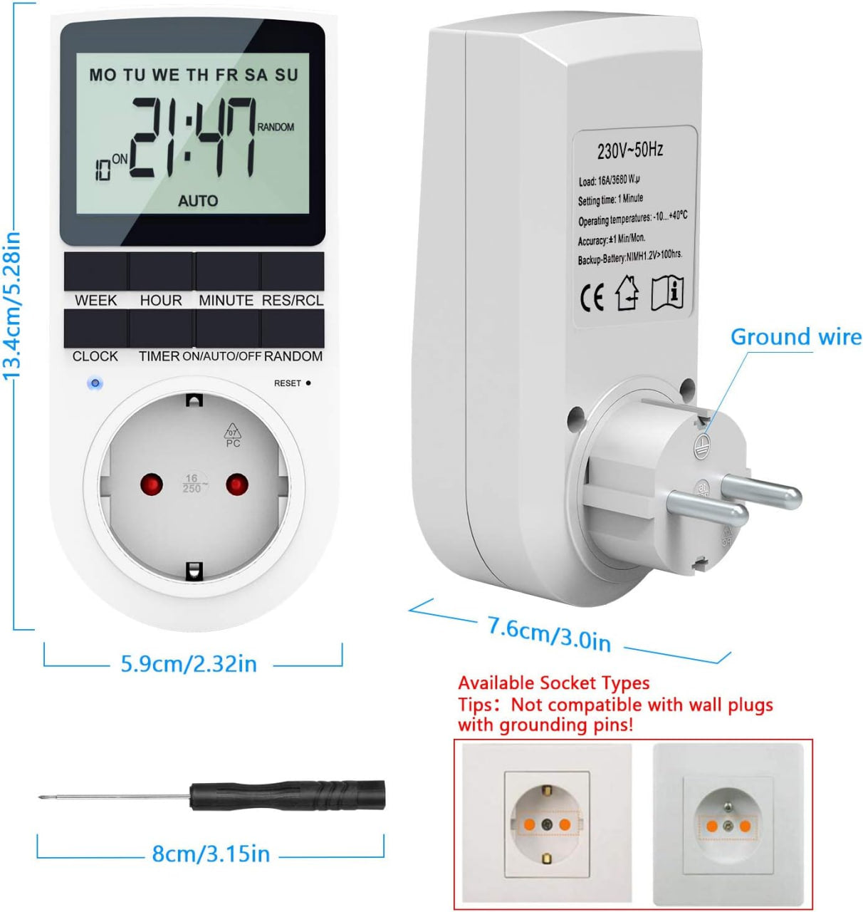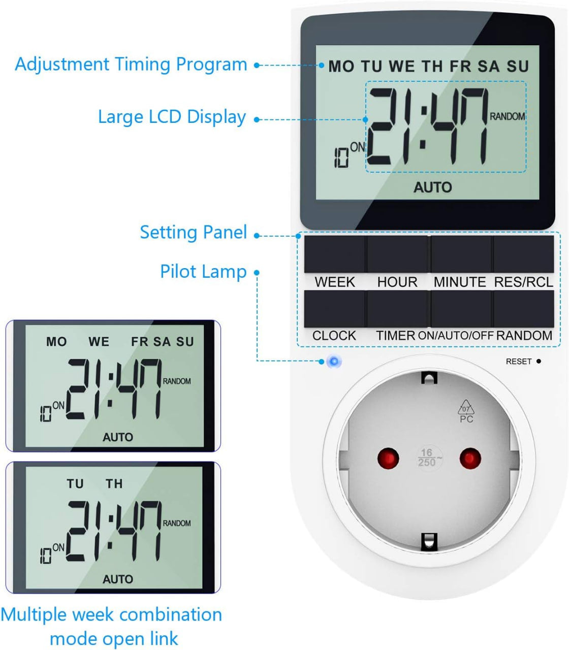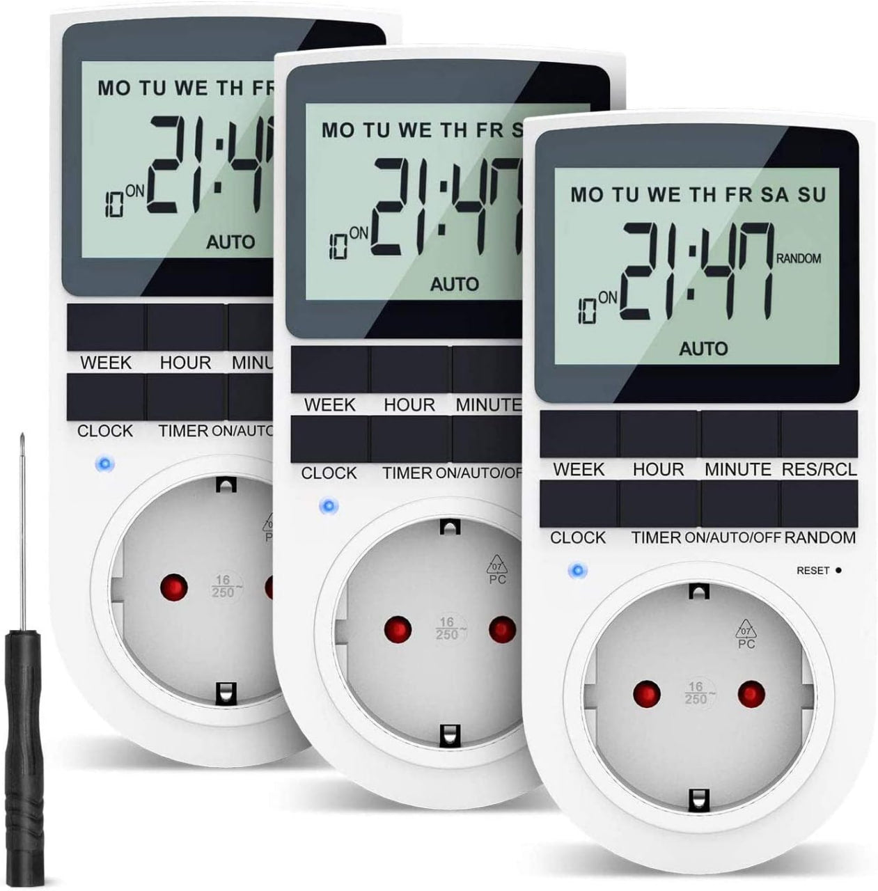 Zestaw RATEL cyfrowych programowalnych gniazdek timera z możliwością ustawienia do 10 programów włączania i wyłączania w ciągu doby, działający w trybie tygodniowym (24 h/7 dni) i wyposażony w wewnętrzną pamięć awaryjną z baterią podtrzymującą ustawienia.