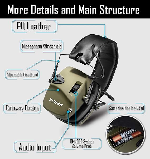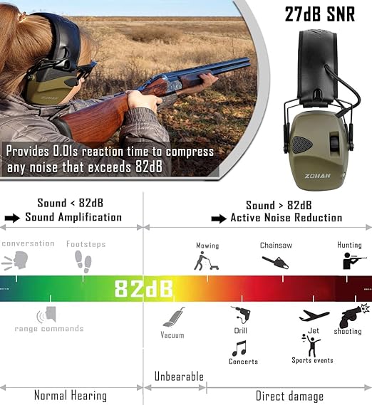 ZOHAN 054 – elektroniczne nauszniki ochronne z aktywną redukcją hałasu (NRR 22 dB / SNR 27 dB). Natychmiast reagują (< 0,01 s) na dźwięki powyżej 82 dB, jednocześnie wzmacniając ciche dźwięki (np. odgłosy otoczenia). Lekka, smukła konstrukcja z gumowaną powłoką, składany pałąk, wymienne nauszniki, regulacja głośności, wejście AUX oraz automatyczne wyłączanie po 4 godz. Zasilanie: 2×AAA.”